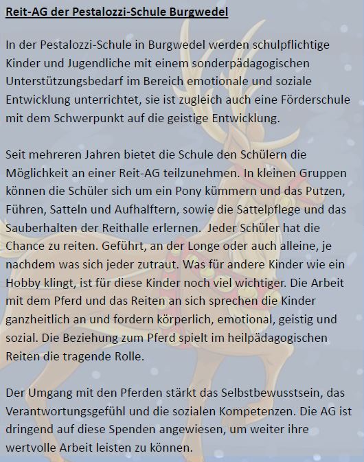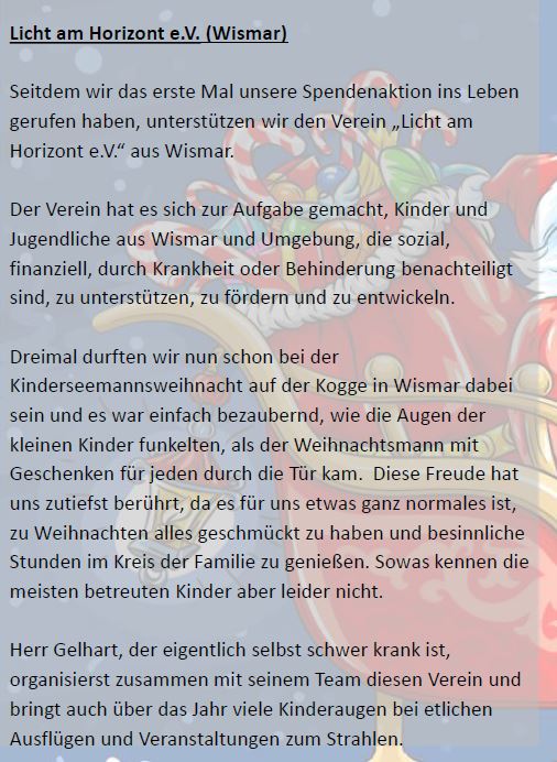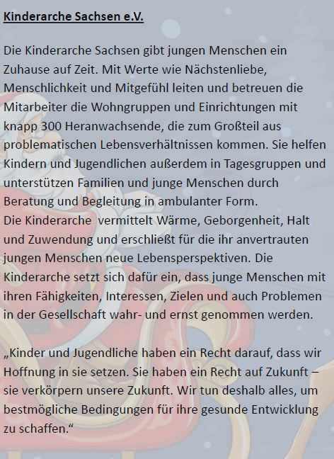Es ist schon zu einer Tradition geworden, dass wir auf das Versenden von Weihnachtskarten an unsere Kunden und Lieferanten verzichten und dieses Geld lieber sinnvoller an Vereine und Organisationen spenden, die das ganze Jahr über Gutes tun und durch Ihre ehrenamtlichen Tätigkeiten helfen, gesundheitlich benachteiligte oder Kinder aus sozialschwachen Familien den Alltag und die Freizeit schöner, behutsamer und sinnvoller zu gestalten.